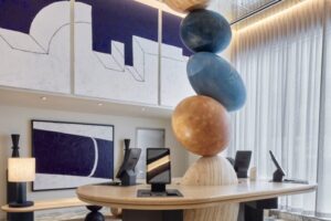 Bright green wall design and changing color lighting design added by architect Rudolph Lesnak to contemporary apartment ideas create unique and...