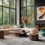 Living room furniture, stove, wood interior design, glass walls