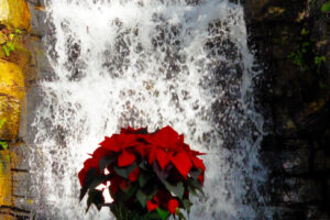 Beautiful Christmas scene, indoor waterfall, seasonal Poinsettia plants
