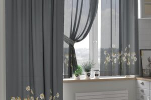 Elegant kitchen curtain ideas, gray fabric panels with floral details