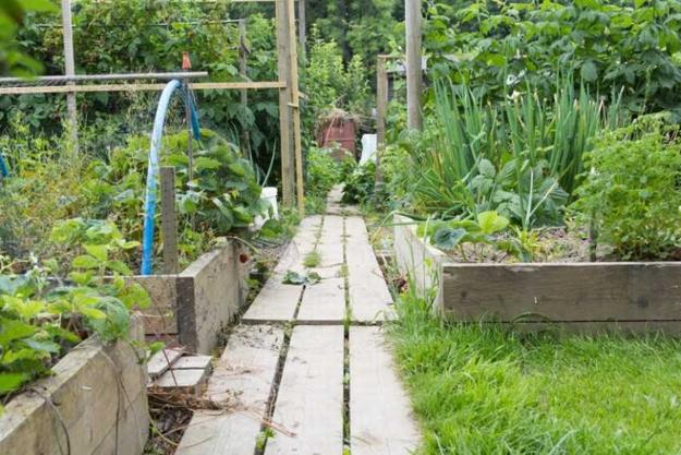 Wooden garden path, raised garden beds